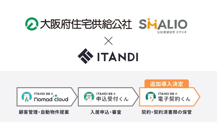 2023年10⽉2日より、地方住宅供給公社で全国2位の管理戸数を有する(※3)、公社賃貸住宅 SMALIO(スマリオ)を提供する大阪府住宅供給公社に、イタンジが提供する、仲介会社利用率No.1 (※4)の不動産関連電子契約システム「電子契約くん」 を導入いたします(※1)。