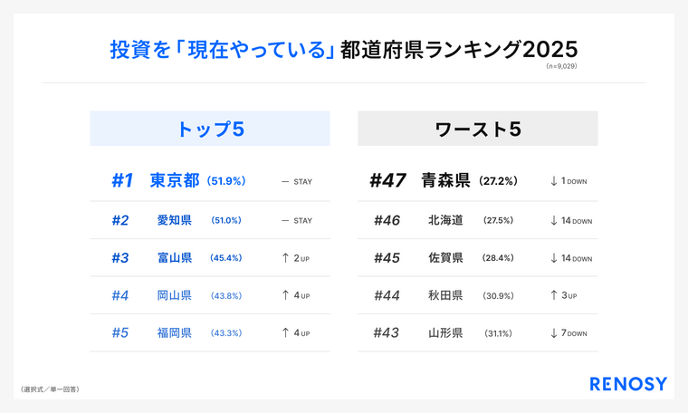 当社が運営するAI不動産投資「RENOSY(リノシー)」は、20代〜50代の男女9,029人を対象に実施した「47都道府県別の投資意識と実態調査2025」を発表しました。