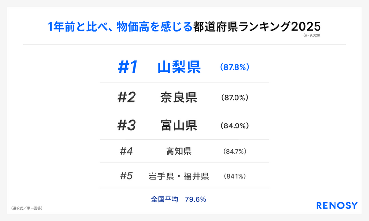 まず、日々の生活の中で「1年前と比べ、物価高を感じる」回答者の割合をランキング化したところ、1位は山梨県(87.8%)、2位は奈良県(87.0%)、3位は富山県(84.9%)という結果でした。また全国平均が79.6%であることから、特定の地域だけでなく全国的に物価高を感じていることがわかります。