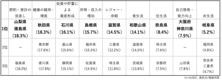 最後に、今後の生活で注力したいことを尋ねました。選択肢のうち、投資やお金にまつわる項目をみてみると「節約・家計の見直し」の1位は同率で山梨県・徳島県(18.3%)、3位は福島県(18.2%)でした。 「投資や貯蓄による資産形成」の1位は石川県(16.1%)、次いで富山県(15.6%)、静岡県(15.1%)と続きます。また「所得・収入の増加」1位は島根県(15.7%)、2位は福井県(15.3%)、3位は佐賀県(14.9%)となりました。