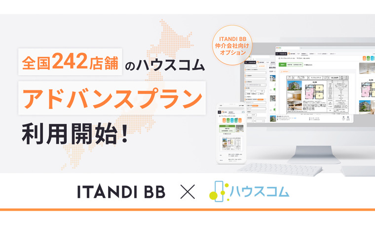 株式会社GA technologies[GAテクノロジーズ](本社:東京都港区、代表取締役 社⻑執行役員 CEO:樋⼝ ⿓、 証券コード:3491、以下「当社」)のグループ会社である、テクノロジーで不動産取引をなめらかにするイタンジ株式会社(以下「イタンジ」)は、2025年7月より、不動産賃貸仲介をコア事業とし、全国に242店舗を展開するハウスコム株式会社(以下「ハウスコム」)において、「ITANDI BB」の有償オプション「アドバンスプラン」の利用が開始したことをお知らせいたします。