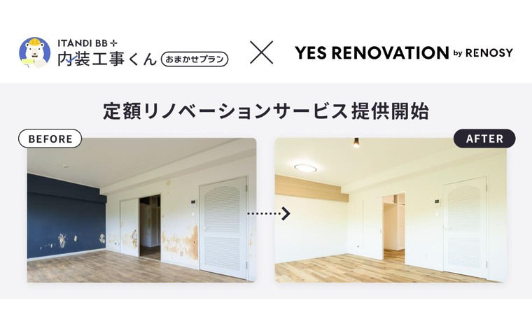 2024年8月より、賃貸物件の原状回復工事の発注・管理システム「内装工事くんおまかせプラン」は、ネット不動産投資サービス「RENOSY」が提供する賃貸専門の定額リノベーションサービス「イエスリノベーション」と提携し、リノベーションサービスの提供を開始いたしました。
