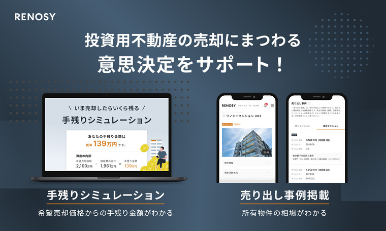 RENOSYは顧客体験向上のため、投資用不動産の運用、売り出しの検討から成約までをサポートする機能を拡充しています。この度は、売却希望価格から諸費用を引いた後の手残り金額がわかる「手残りシミュレーション」の提供を開始しました。また、所有物件と同じマンションや周辺地域にあるマンションの「売り出し事例」をマイページに掲載しました。