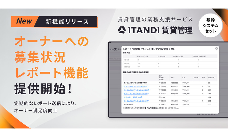 当社のグループ会社である、テクノロジーで不動産取引をなめらかにするイタンジ株式会社(以下「イタンジ」)が提供する賃貸管理の業務支援サービス「ITANDI 賃貸管理」の基幹システムセットに、不動産オーナー(以下「オーナー」)満足度向上を目的とした、各種新機能を順次提供開始いたします。第一弾として、9月より新たに「募集状況レポート機能」を追加しました。