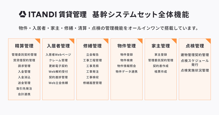 「ITANDI 賃貸管理」の基幹システムセットは、賃貸不動産管理会社(以下「管理会社」)の賃貸管理業務における精算管理・物件管理・入居者管理・オーナー管理・修繕管理・点検管理を一括して効率化する賃貸管理システムです。イタンジの各種システムと連携することで、ワンストップで管理業務の効率化を実現します。
