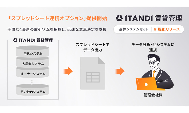 株式会社GA technologies[GAテクノロジーズ](本社:東京都港区、代表取締役 社⻑執行役員  CEO:樋⼝ ⿓、 証券コード:3491、以下「当社」)のグループ会社である、テクノロジーで不動産取引をなめらかにするイタンジ株式会社(以下「イタンジ」)は、2025年8月26日より、賃貸管理の業務支援サービス「ITANDI 賃貸管理」の基幹システムセットにおいて、有効な契約や入金情報をはじめとする賃貸管理業務に関する集計元データを出力できる「スプレッドシート連携オプション」(以下「本サービス」)を提供開始いたします。