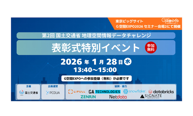 当社は、1月28日に東京ビッグサイトで開催される「G空間EXPO2026」内で開催される「第2回 国土交通省 地理空間情報データチャレンジ」の表彰式に、当社Advanced Innovation Strategy Center(以下、AISC)室長であり主席研究員の稲本 浩久が出席することをお知らせします。また、表彰式特別イベントのパネリストとして、AISCに所属する橋本武彦が登壇いたします。