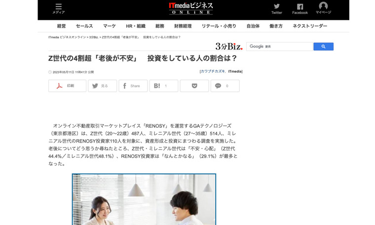 ITmedia ビジネスオンラインにて、ネット不動産投資サービスブランド「RENOSY(リノシー)」が実施した資産形成と投資にまつわる調査をご紹介いただきました。