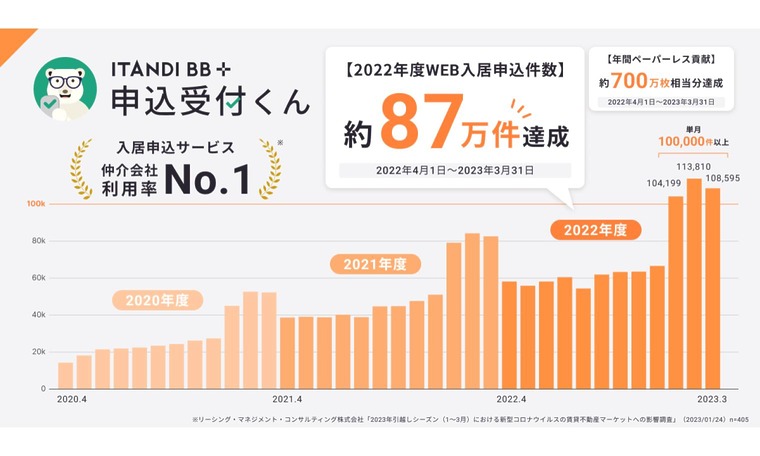 【ITANDI NEWS】2023年4月号 「申込受付くん」WEB入居申込件数 年間約87万件!