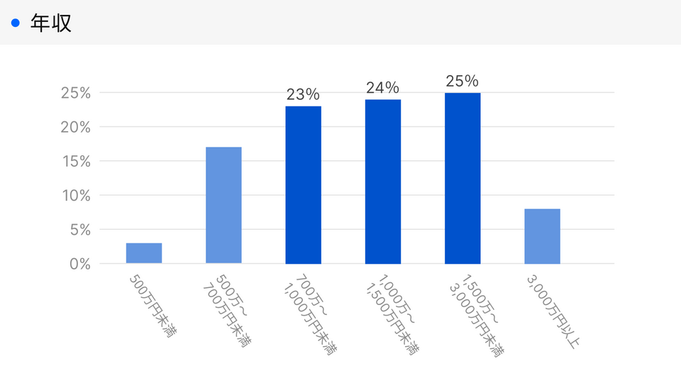 2025年における成約顧客の年収は、700万円〜1,000万円未満が23%、1,000万円〜1,500万円未満が24%、1,500万円〜3,000万円未満が25%でした。 グラフからも特定の年収帯に限定されず、幅広い層のお客様がそれぞれのライフスタイルにあわせて不動産投資を選択している傾向が見てとれます。