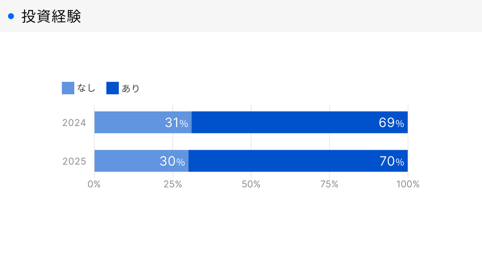 2025年における投資経験の有無は、「あり」の回答率が70%、「なし」が30%でした。2024年と比較すると「投資経験あり」の回答は増加傾向にあります。さらに、2021年に公開した初回のレポートと比べると、2020年の「投資経験あり」の回答は54%(※1)であり、16pt上昇しています。このような結果により、投資そのものに対する関心が広がっているという実態が明らかになりました。