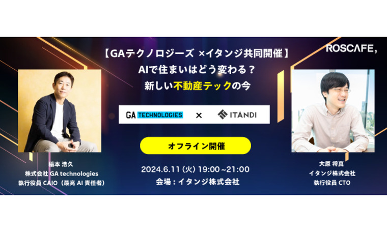 当社は、テクノロジーで不動産取引をなめらかにするイタンジ株式会社と、2024年6月11日(火) にROSCA株式会社が主催するコミュニティ「ROSCAFE」で、『【GAテクノロジーズ×イタンジ共催】AIで住まいはどう変わる?不動産テックの今』を開催いたします。